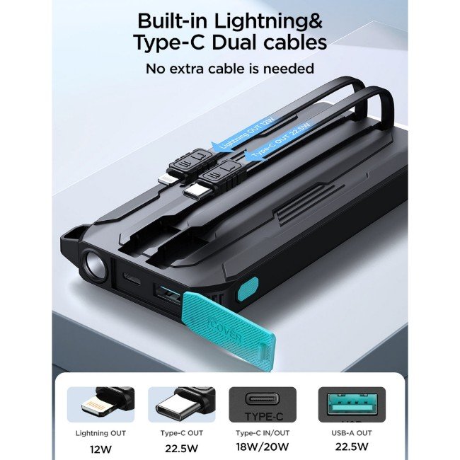| Built-in Cables | USB-C (22.5W) + Lightning (12W) |